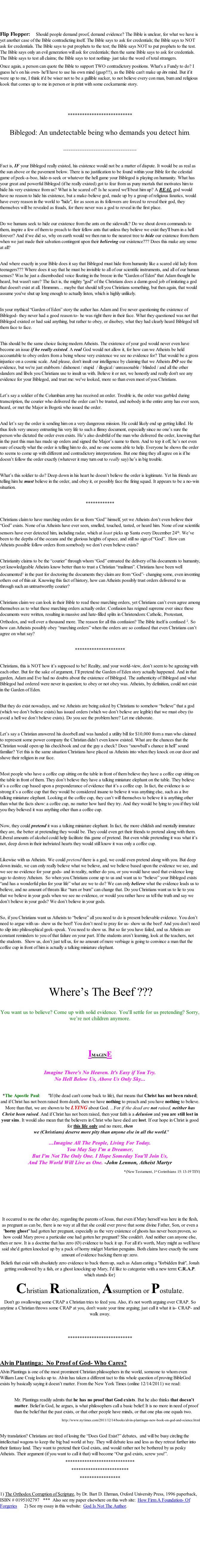 Let's get right down to it: where's the damn beef??? Christians are good at making claims, but not so good at backing them up. You Christians want a chance to prove your case beyond dispute? Here's your chance. In the words of President Dumbass, "Bring it on!".