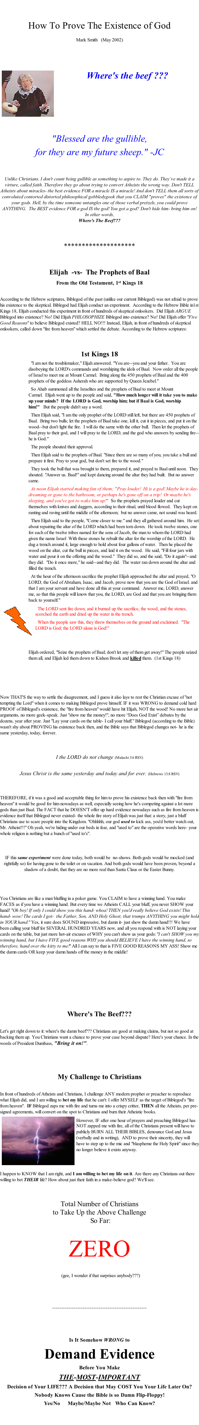 In front of hundreds of Atheists and Christians, I challenge ANY modern prophet or preacher to reproduce what Elijah did, and I am willing to bet my life that he can't: I offer MYSELF as the target of Biblegod's "fire from heaven". IF Biblegod zaps me with fire and turns me into a crispy critter, THEN all the Atheists, per pre-